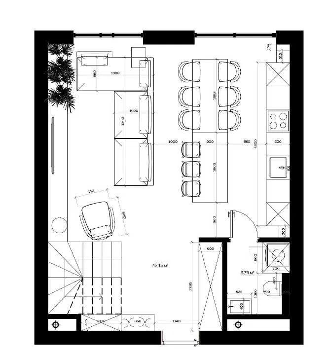 Перший рівень (45 м²) – простора кухня-вітальня з каміном та гостьовим санвузлом. Відкритий світлий простір ідеально підходить як для щоденного відпочинку, так і для зустрічей з друзями.