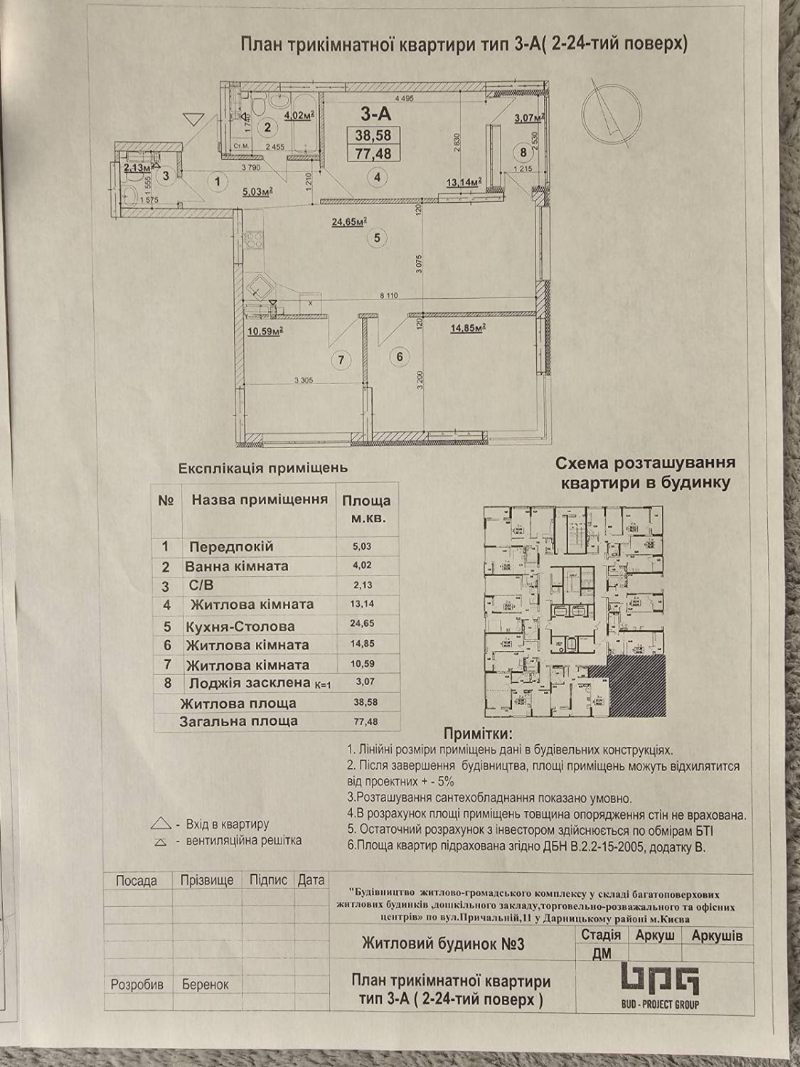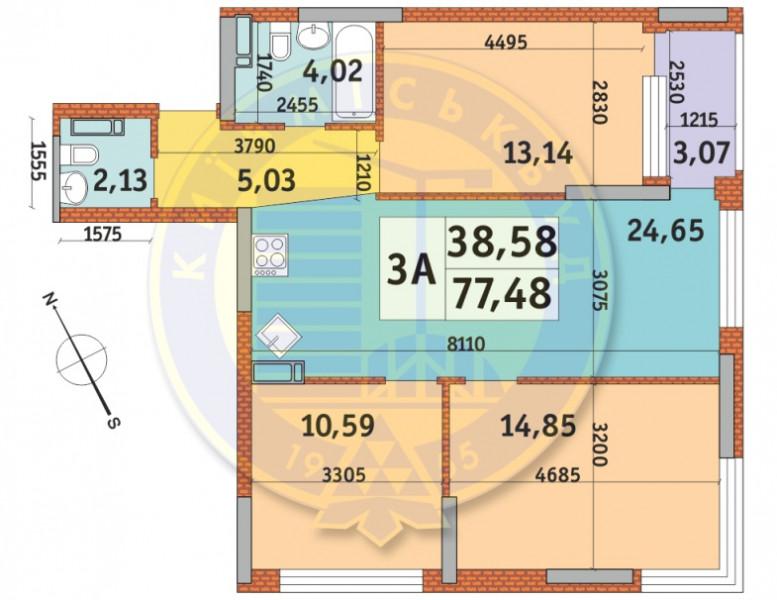 Загальна площа 77,48 кв.м, житлова площа 38,58 кв.м, кухня-вітальня 24,65 кв.м.,