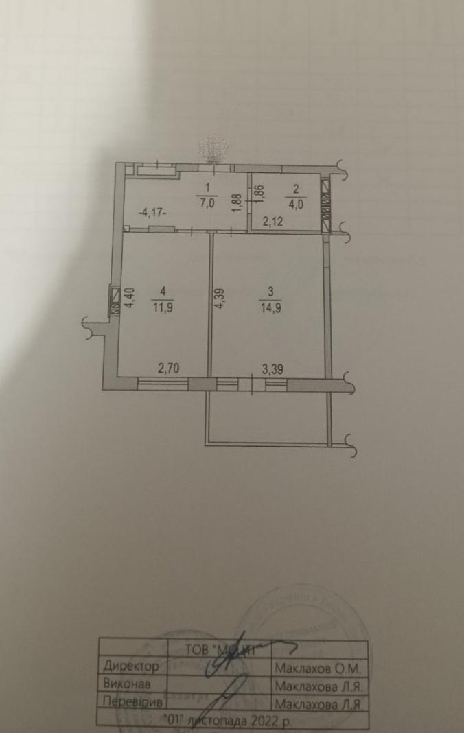 1 кімн. | 2/9 пов. | 39.40/14.90/11.90 м²