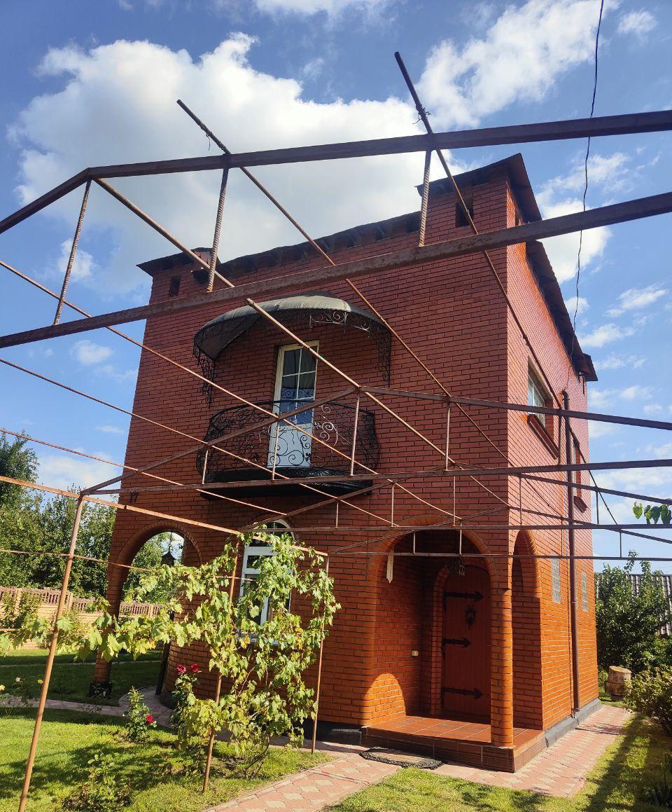 Продається 2-х поверховий будинок на 6 сотках в садовому товаристві по вул. Берковецька 9\11. Будинок побудований в 2 цегли , товщина стін півметра, 2 поверхи , 3-тій поверх -тераса. Загальна площа будинку 108 кв.м (3 кімнати). На першому поверсі кімната, кухня, санвузол. На другому поверсі дві кімнати (одна з каміном і кованим балконом). Перекриття у будинку : дубові балки, підсилені двотавровою стальною балкою. З другого поверху по сходах є вихід на терасу, звідки відкривається чудовий краєвид. Внутрішнє оздоблення будинку: