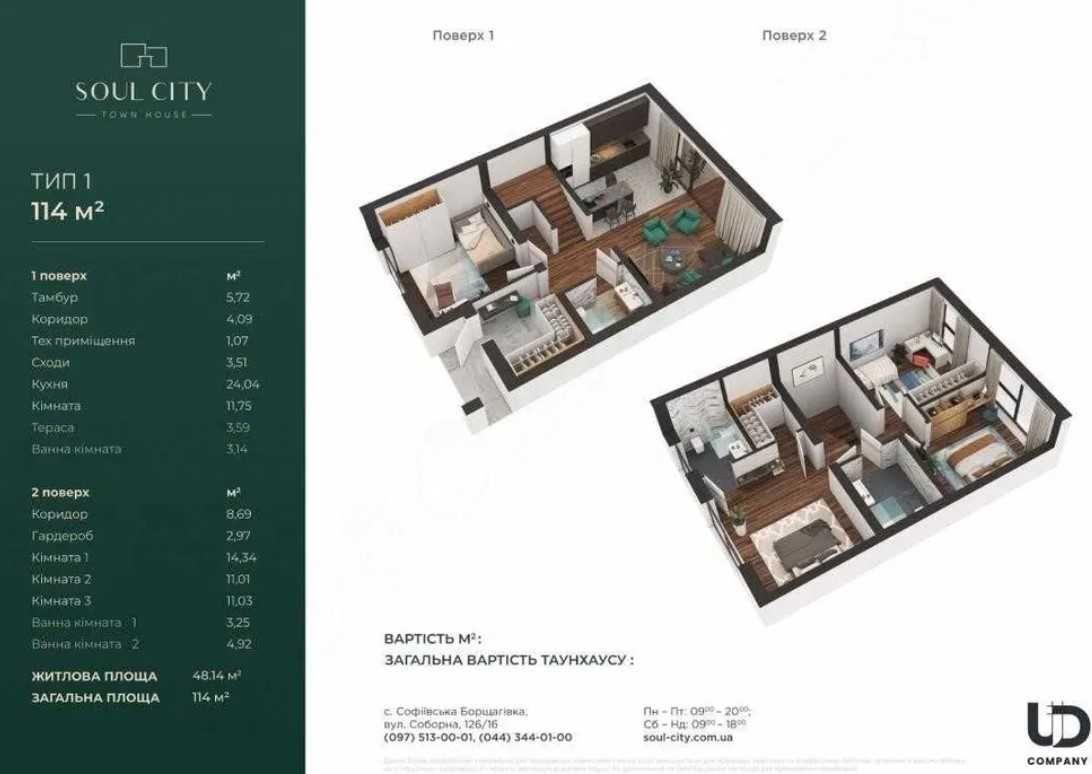 Продам 4-кімнатний таунхаус 104 кв.м у котеджному містечку Soul City. Двоповерховий будинок із зручним плануванням: житлова площа 52 кв.м, два санвузли, ванна кімната 6,7 кв.м. Підвал 50 кв.м у подарунок. Стан — з наповненням, під ремонт. Встановлені вікна REHAU, вхідні двері, виконана стяжка та штукатурка, автономне газове опалення, всі лічильники. Закрита територія з охороною і відеоспостереженням, власне паркомісце, дитячий майданчик. Поруч школа, садочок, супермаркети — до 5 хвилин.Комісійні АН сплачує покупець.