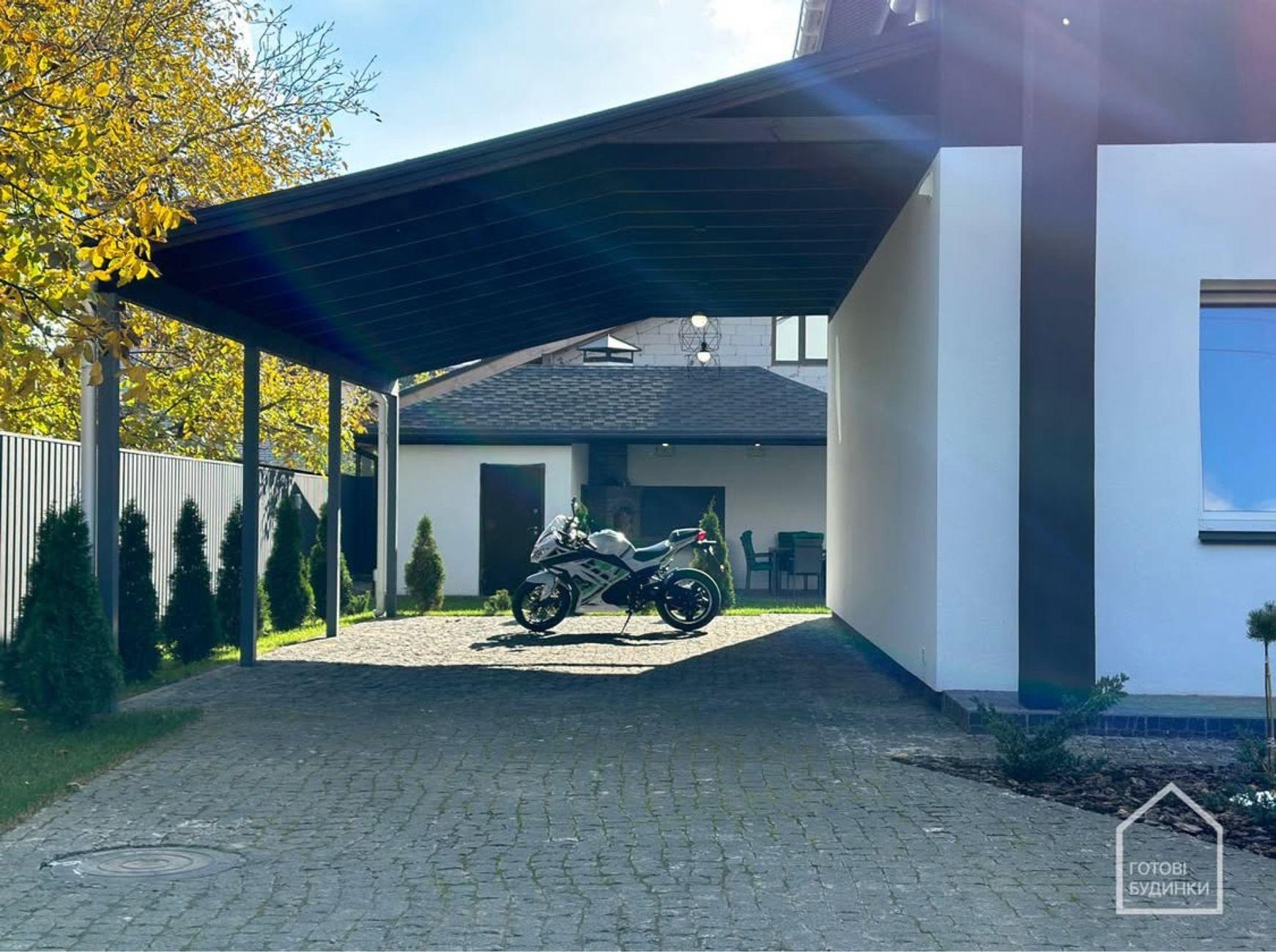 Паркування: навіс на 2 авто + 2 додаткові місця, зарядка для електромобіля