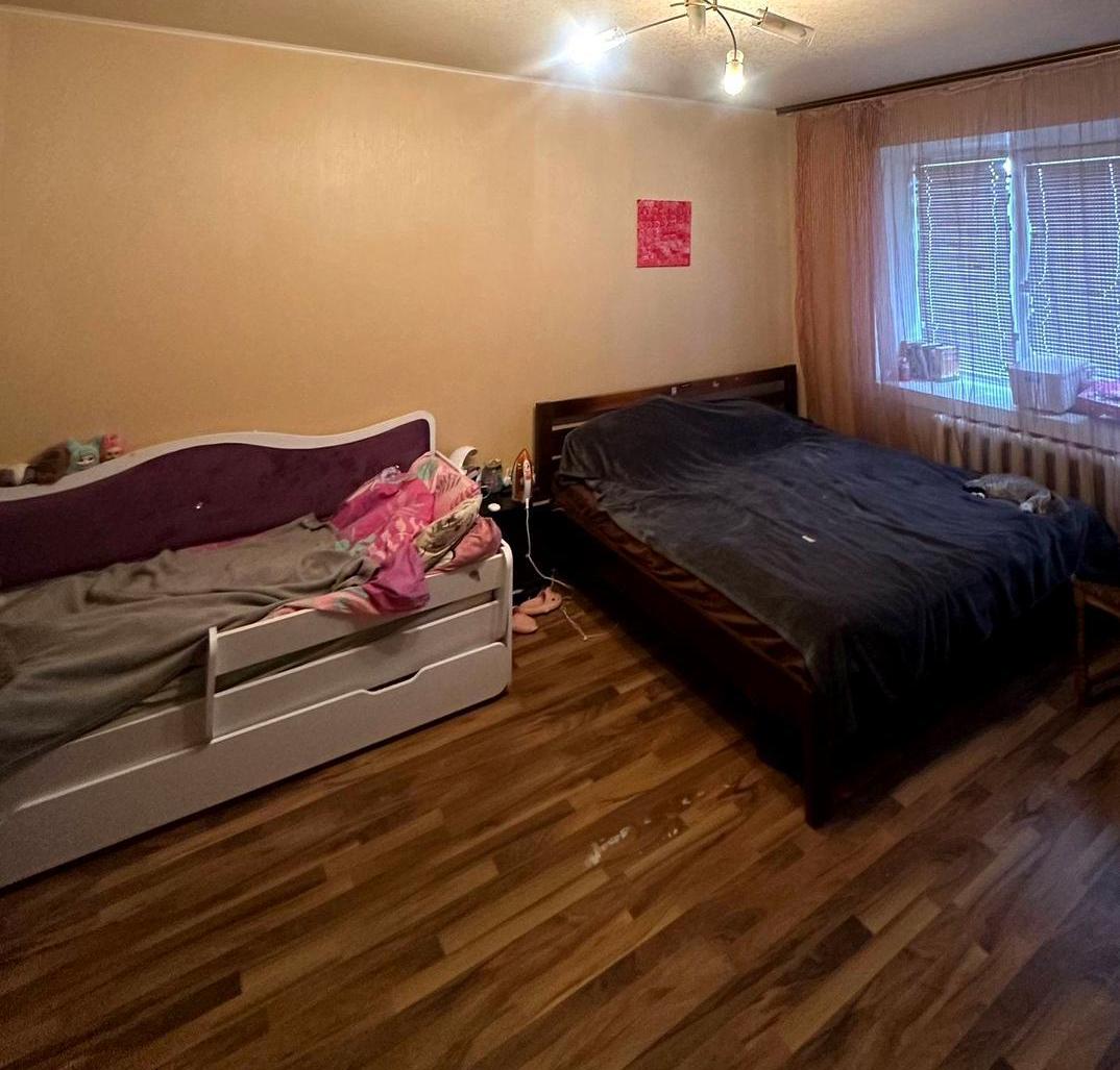 три окремі спальні, балкон, санвузол (встановлена вбиральня, виведені труби під умивальник та душ/ванну), стіни підготовлені під фарбування або шпалери — можна завершити ремонт на власний смак.